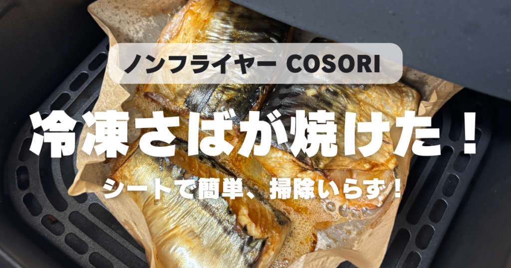冷凍サバはノンフライヤーで焼けるの?と気になって、COSORIで実際に試してみました。 結論は、205℃で4分予熱→195℃で20分(片面10分ずつ)で、皮パリ&中ふっくらに仕上がります。 冷凍のまま調理したリアルな仕上がりや、匂い・油の出方、気になった点も正直にレビューしています。 -