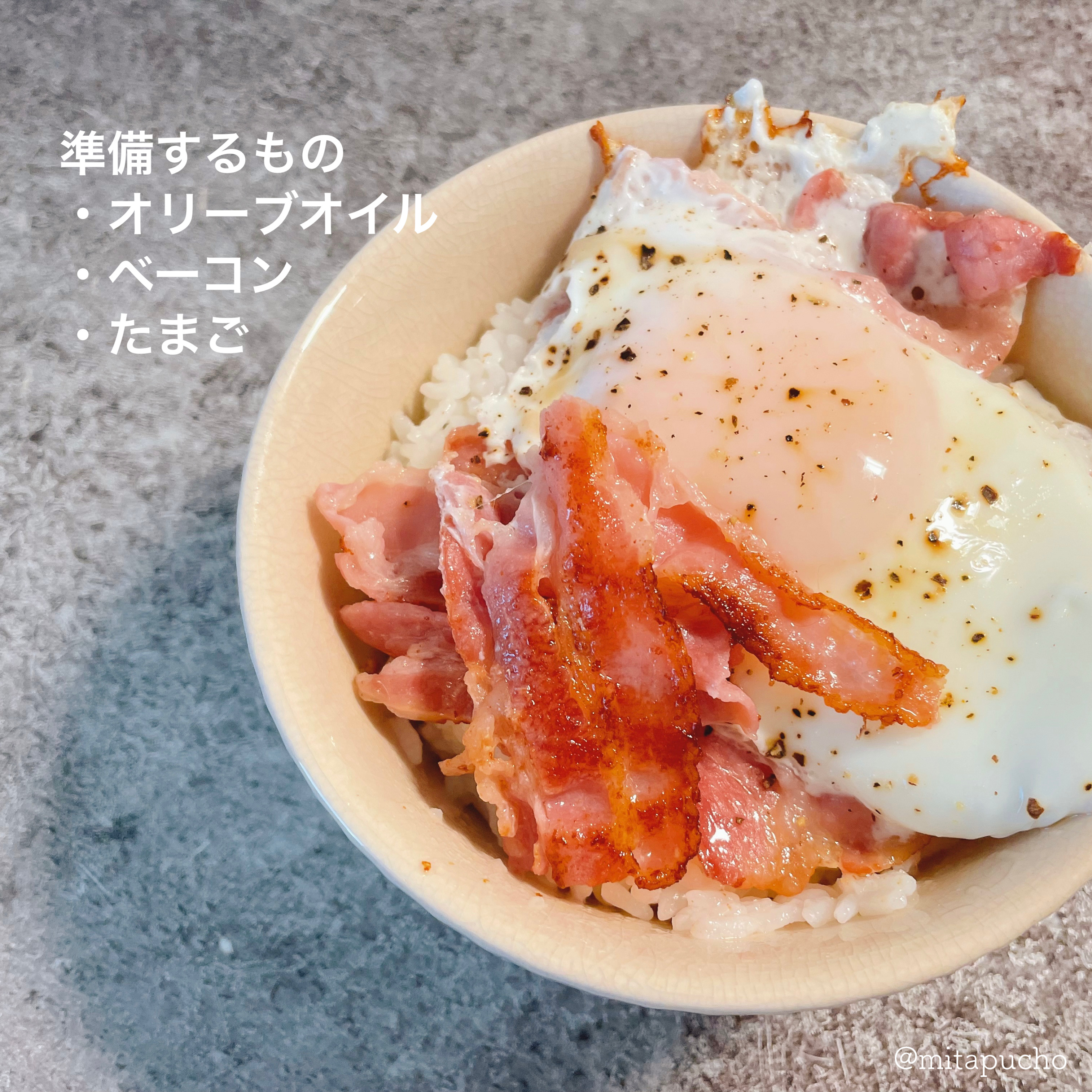 【材料】オリーブオイル、ベーコン、卵、(お好みで)醤油
