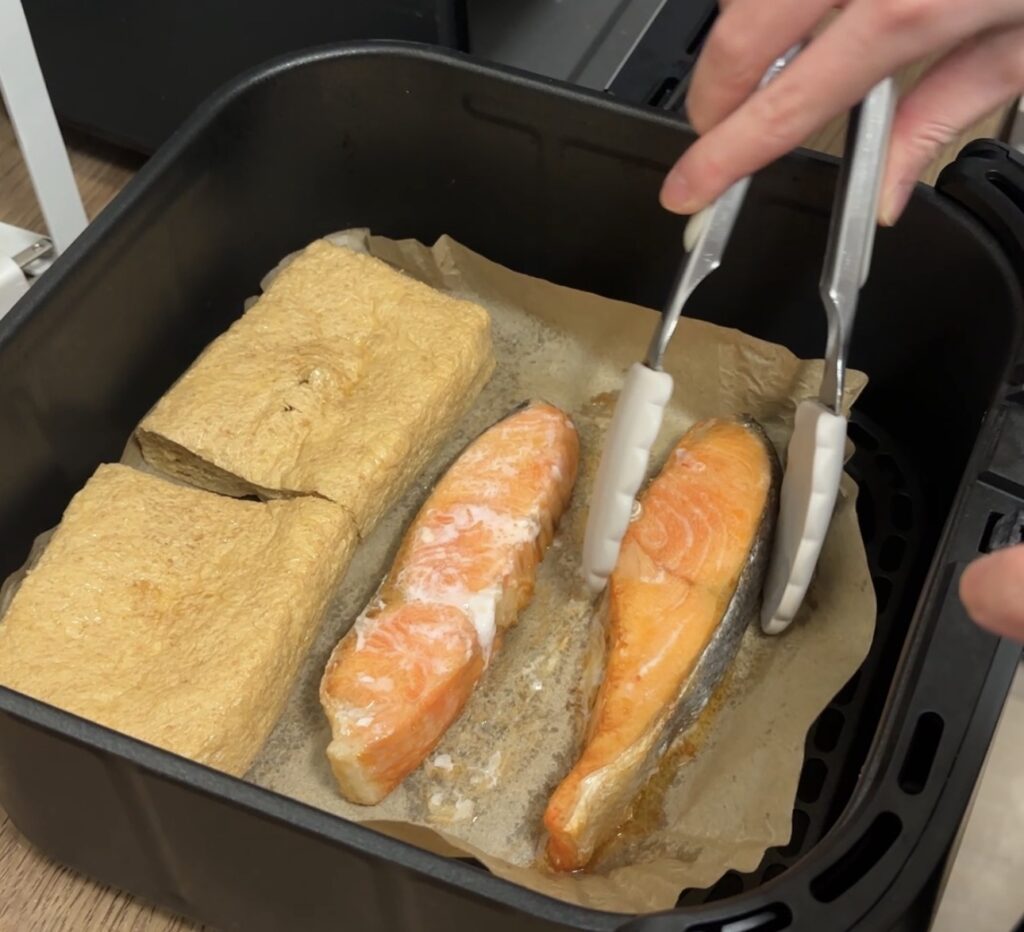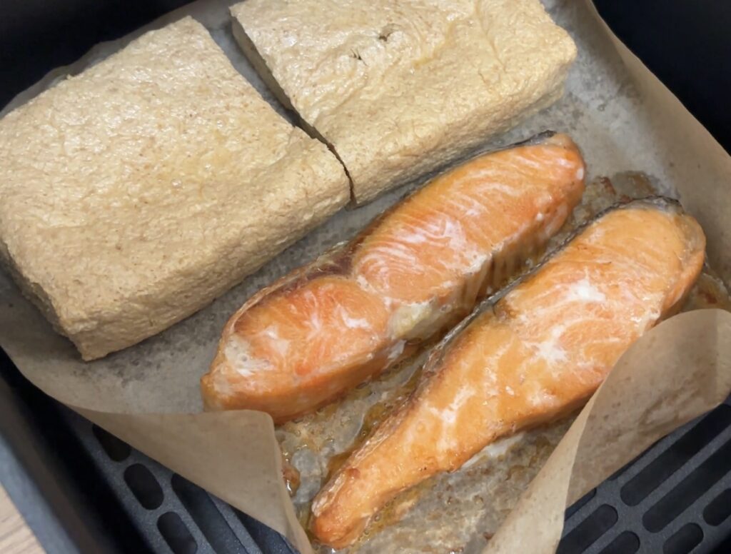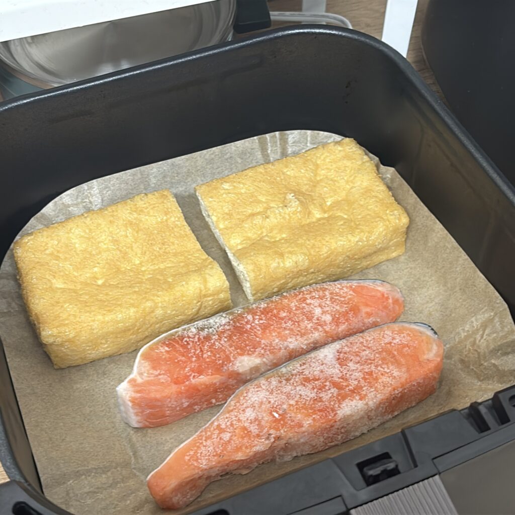 結論から言うと、厚揚げ2枚と、分厚い冷凍鮭2枚が「同時」に完璧に焼けます。