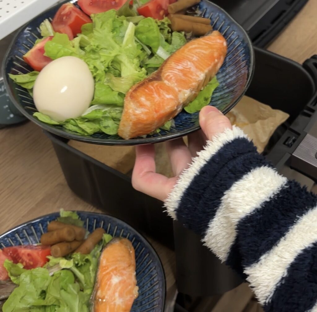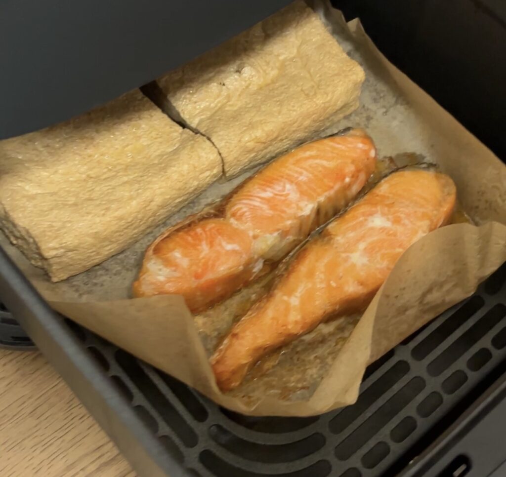 6Lなら厚揚げ2枚と鮭2枚が余裕で入るので、「家族分を何回も焼く」というストレスもありません。