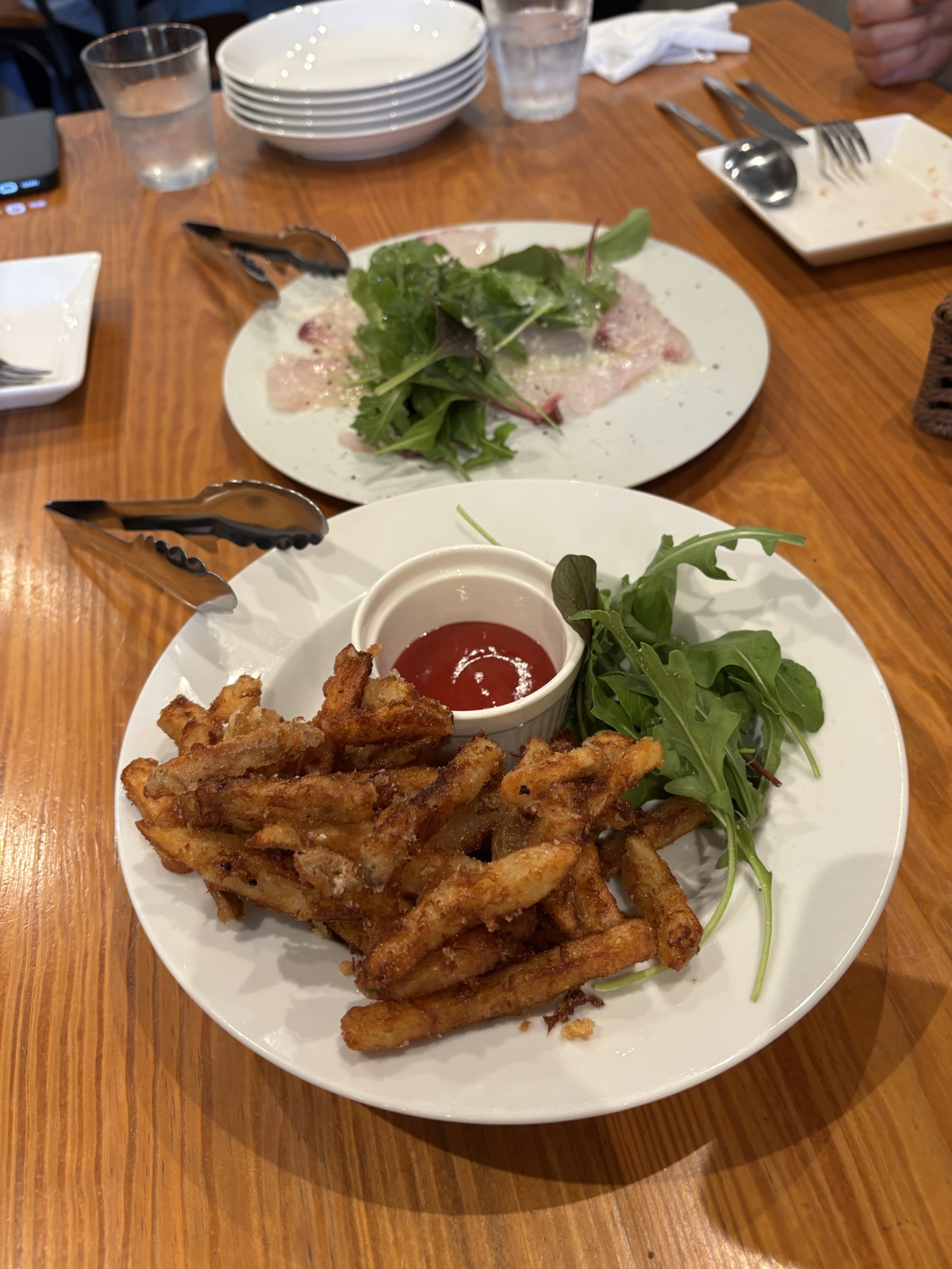 私たちは5人でシェアして、色々なメニューを楽しむことにしました。まずは、カリッと揚がった美味しいポテトと、新鮮な魚介がたっぷり乗ったカルパッチョ。